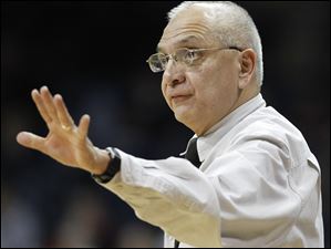 St. John's Jesuit's Cheatham Norrils (24) goes to the net against Bowsher's Robert Davis (1) and Mookie Mustafaa (24) during the City League boys basketball semifinal Feb. 22, 2011, at Savage Arena in Toledo, Ohio.