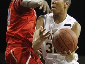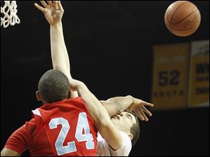 St. John's Jesuit's Marc Loving (32) goes to the net against Bowsher's Maurice Birdsong (45). Loving would score a game-high 30 points for the Titans.