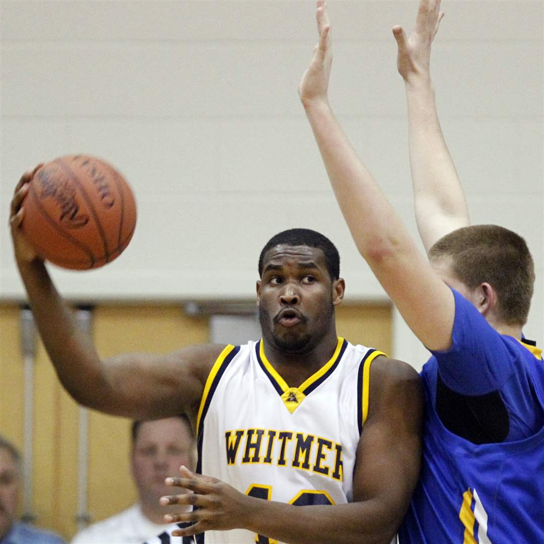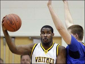 Findlay's Brock Ammons defends as Whitmer's Nigel Hayes (23) goes to the net. Hayes would add 10 points to the Panthers 47-35 victory over the Trojans.
