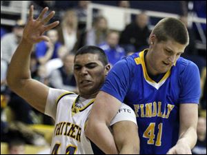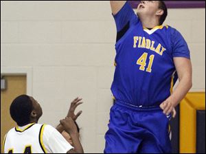 C.J. Gettys (41), a 6-foot-10 junior, lays up 2 points for Findlay against Whitmer's Franklin Lindsey (14).