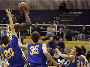 Whitmer's Nigel Hayes (23) shoots over Findlay defenders in a non-league high school boys basketball game Feb. 16, 2011, in Toledo, Ohio.