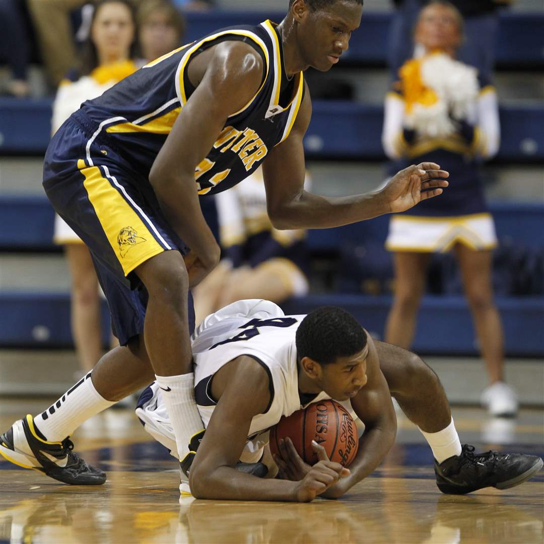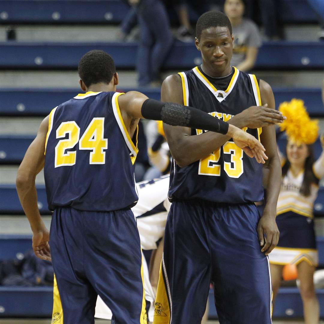 Whitmer players Leroy Alexander (24) and Nigel Hayes (23) slap five as they beat St. John's Jesuit.