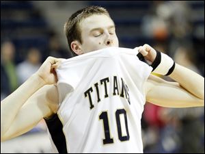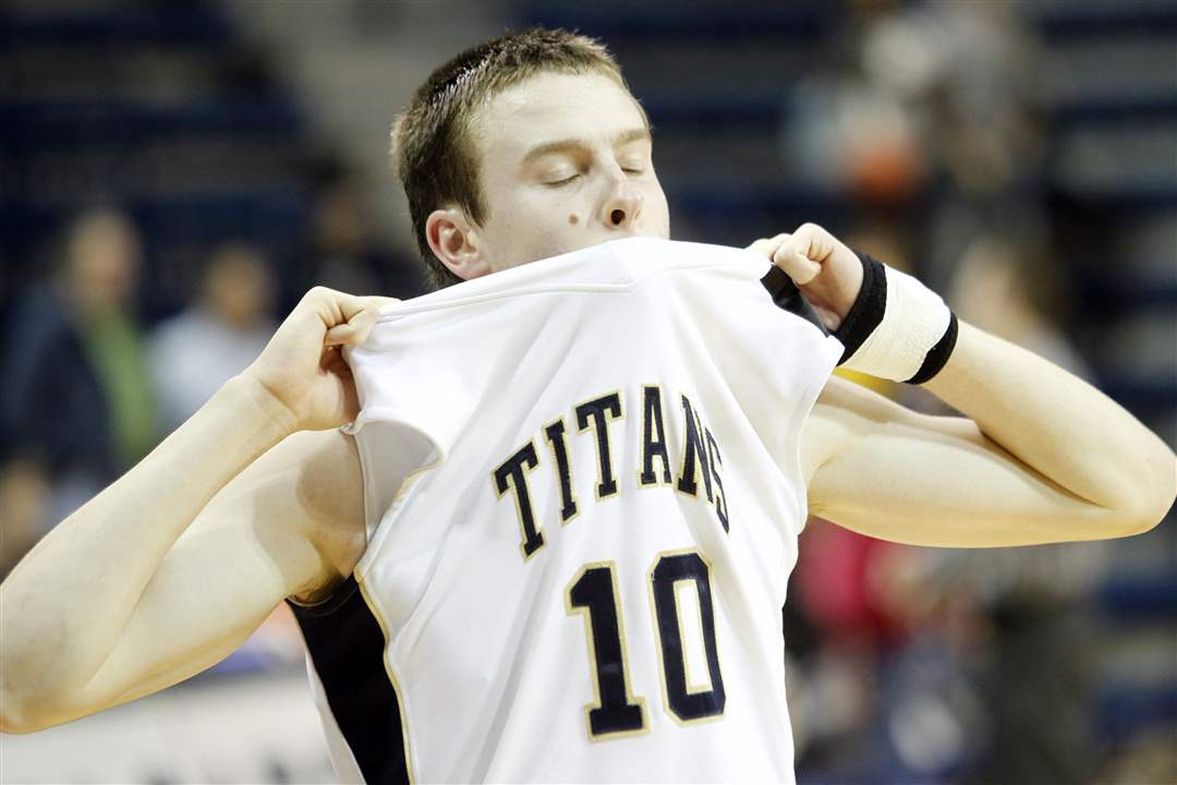 A dejected Austin Gardner (10) of St. John's Jesuit heads off the floor after the Titans lose to Whitmer High School.