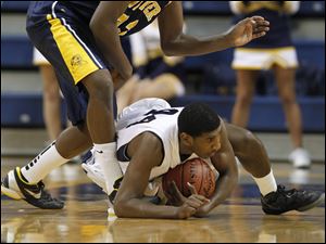 Whitmer's Leroy Alexander grabs the ball in a heap of players as St. John's DJ Bonds (14) left, moves in during the second quarter.