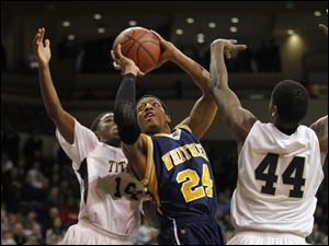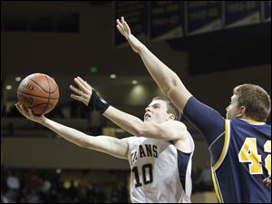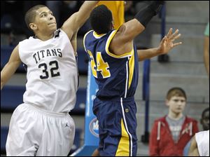 St. John's Jesuit player Marc Loving (32) gets the reverse layup to put the Titans ahead of Whitmer High School during the third quarter.