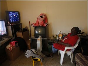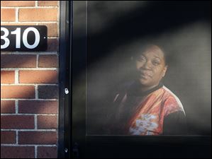 Lionel Patrick looks out of the window of his children's apartment in the Brand Whitlock Homes before heading to classes at the University of Toledo.