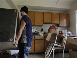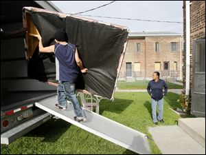 Cassandra Cofie watches as Donald Smith carries her daughter’s belongings out of her apartment at Brand Whitlock Homes in Toledo. The city’s oldest public housing site, named after at Toledo mayor, is to be demolished.