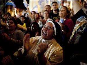 People wave Argentine flags and sing outside the Metropolitan Cathedral on March 13 to celebrate that the new pope is Jorge Bergoglio, Buenos Aires' former archbishop.