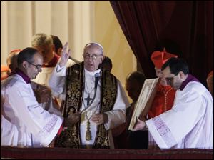 Pope Francis waves the crowd from the central balcony of St. Peter's Basilica on March 13 at the Vatican.
