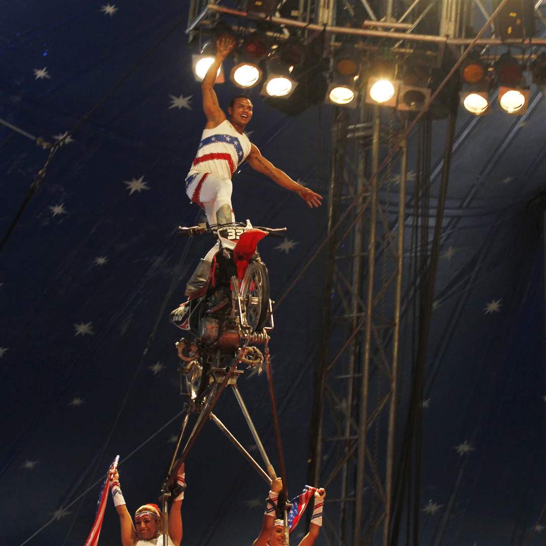 A motorcycle act/high wire act during the Carson & Barnes Circus at the Westfield Franklin Park Mall in Toledo, Ohio.