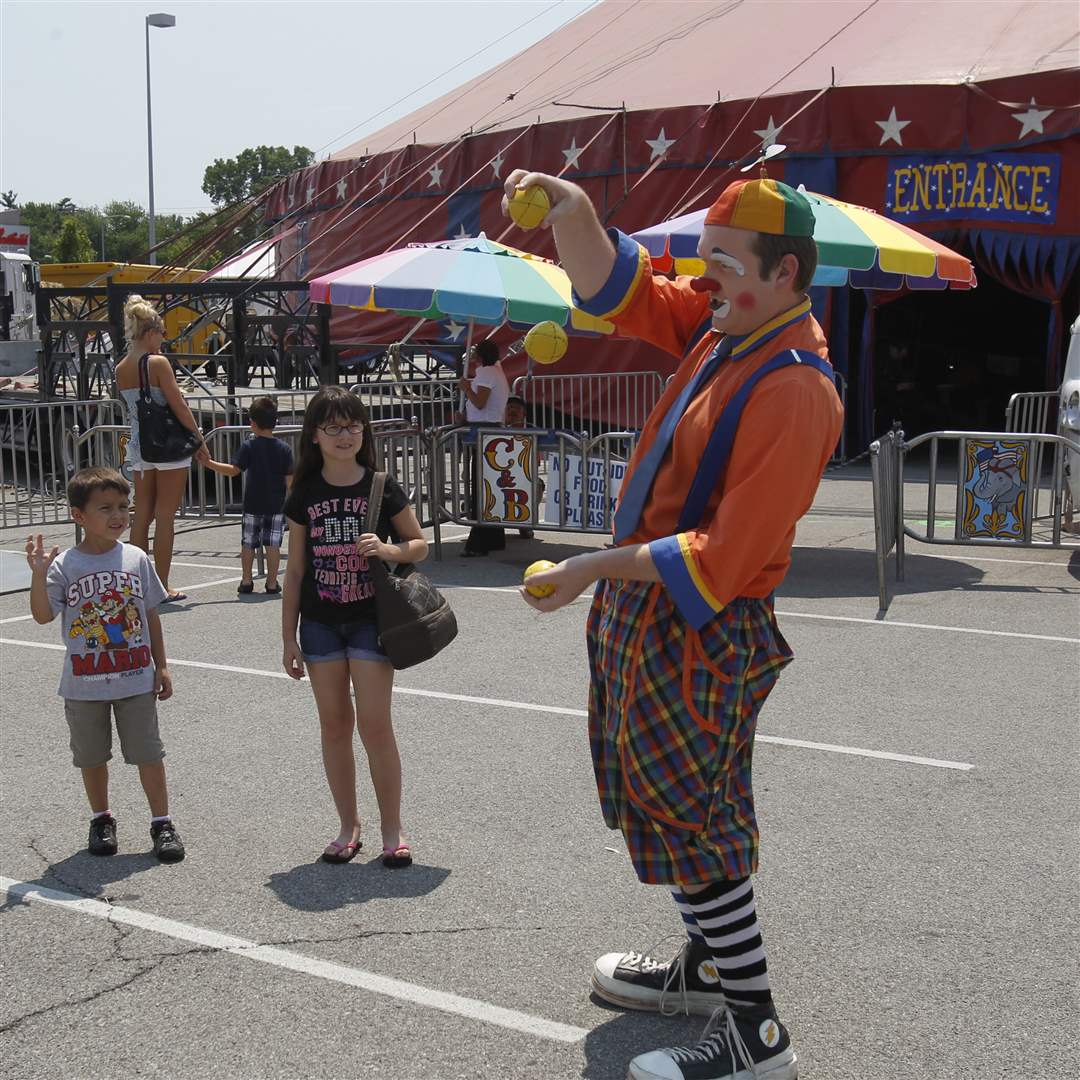 Nathen Nagle, 6, and his sister Hannah Nagle, 10, of Toledo, watches Melvino the Clown prior to start of the Carson & Barnes Circus at the Westfield Franklin Park Mall in Toledo, Ohio.