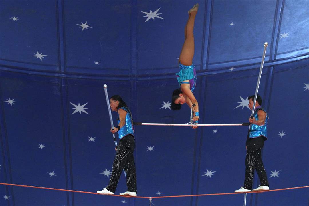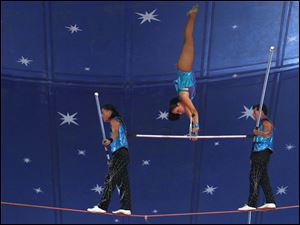 A high wire act without a safety net keeps the audience on the edge of their seats during the Carson & Barnes Circus at the Westfield Franklin Park Mall in Toledo, Ohio.