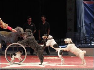 Dogs perform tricks during the Carson & Barnes Circus at the Westfield Franklin Park Mall in Toledo, Ohio.