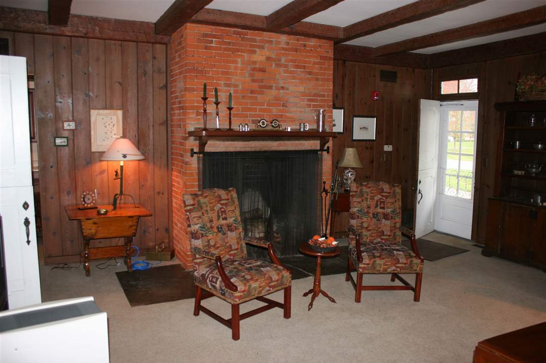 The massive fireplace in the living room of the rustic lodge, which was built in the late 1800s.