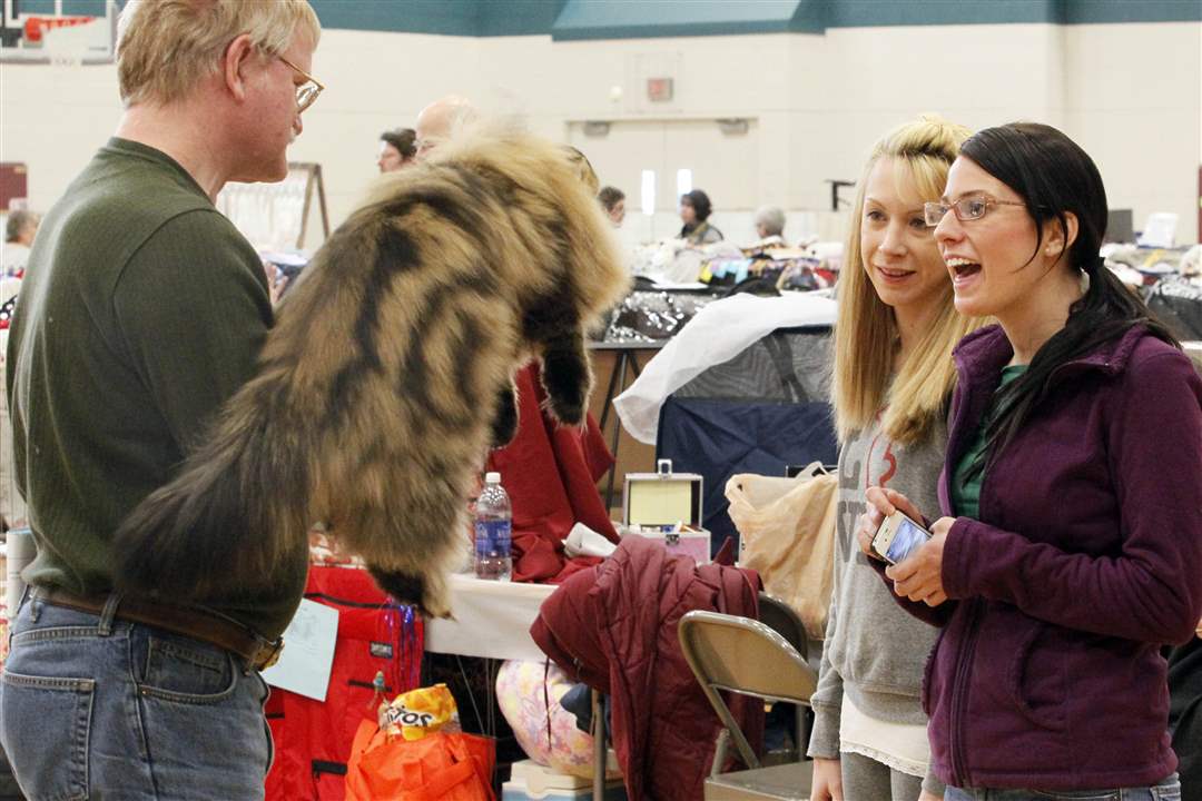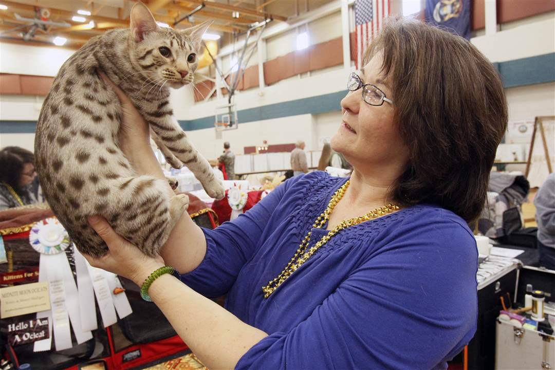 Lorna Friemoth of Columbus tickles her Japanese bobtail before showing her during the event.