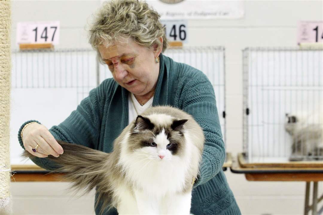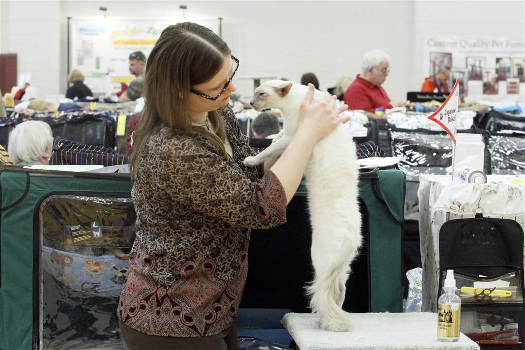 Lorna Friemoth of Columbus prepares her Balinese cat before showing him.