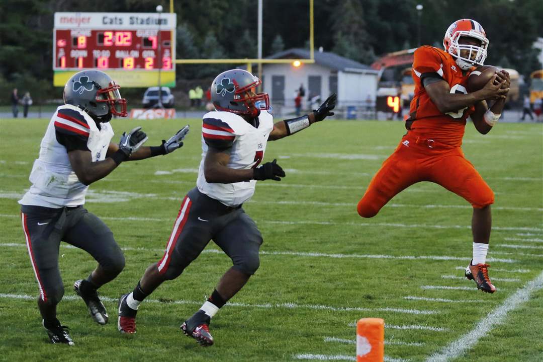 Sylvania Southview RB Keith Gilmore (9) makes a catch against Central Catholic DB Stephon Campbell (7).