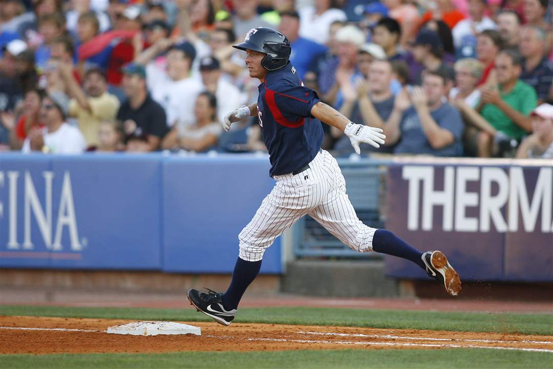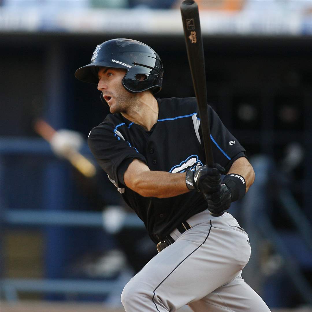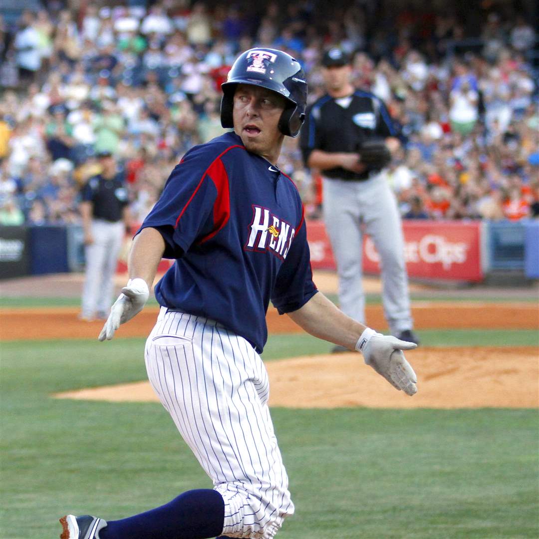 Syracuse Chiefs player Steve Lombardozzi (4) hits a single in the third inning at Fifth Third Field.