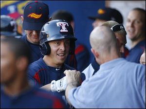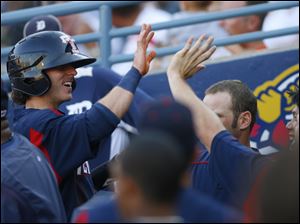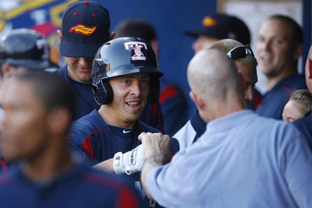 Hens player Will Rhymes is congratulated in the dugout after scoring in the first inning.