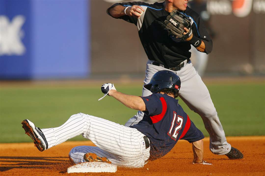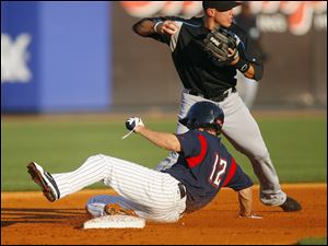 Toledo Mud Hens player Jeff Salazar (12) is forced out at second by Syracuse Chiefs player Seth Bynum (11) who can't turn the double play during the first inning at Fifth Third Field.