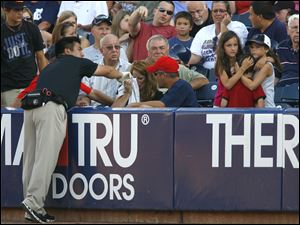 A trainer with the Syracuse Chiefs tends to a fan that was hit by a ball at Fifth Third Field.