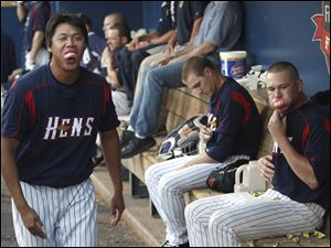 Toledo Mud Hens pitcher Ryan Perry, right, and fellow pitcher Fu-Te Ni, left, entertain teammates with an impromptu gum eating contest during a game with the Syracuse Chiefs. Ni put 44 pieces of gum in his mouth, but was outclassed by Perry who didn't stop until stuffing 55 pieces in his mouth.
