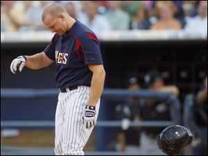 Toledo player Scott Thorman throws his helmet after striking out to end the third inning against Syracuse.