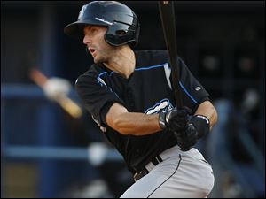 The Mud Hens' Timo Perez (6) hits a double in the fifth inning against Syracuse.