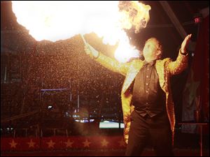 The human volcano Brian LePalme blows fire during the Kelly Miller Circus Monday, 08/08/11, in Kelleys Island, Ohio.