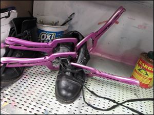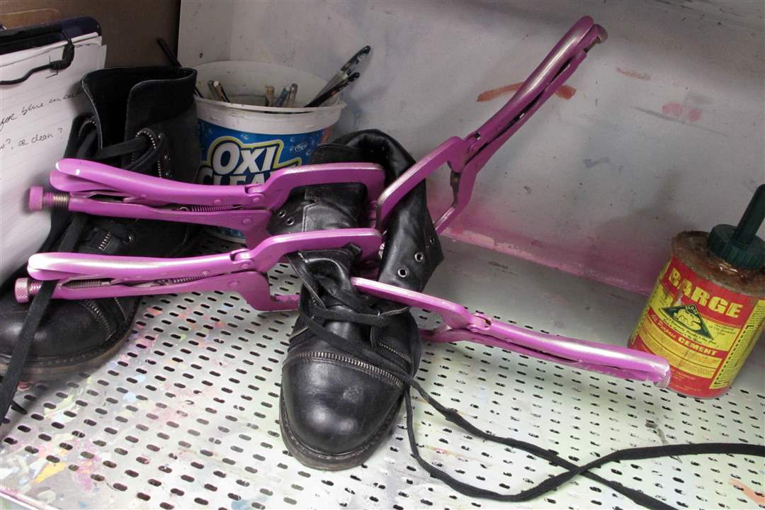 A boot is worked on in the wardrobe room.