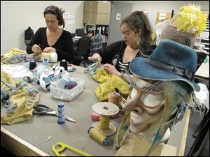 Wardrobe assistants Gaya Mugnai, from Italy, and Rikki Saffell, of Wisconsin, repair uniforms worn by the performers in the wardrobe room.