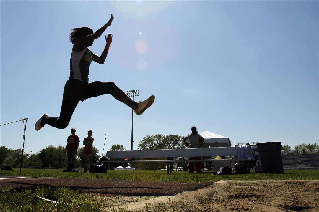 SPT cltrack12p Toledo Start long jumper Jada Fortune flies through the air as she wins the event on her last attempt at the City League track and field meet at Rogers High School, Friday, May 11, 2012. The Blade/Andy Morrison