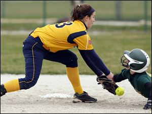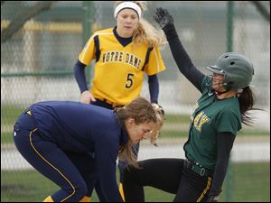 Oregon Clay's Lindsay Schiavone tags out Notre Dame's Cassie Gillespie at second base.