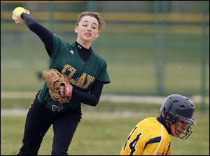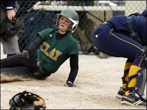 Oregon Clay's Courtney Quinlan scores the 10th and final run in the fifth inning.