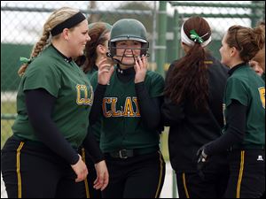 Oregon Clay's Jamie Miller celebrates hitting her home run with teammates.