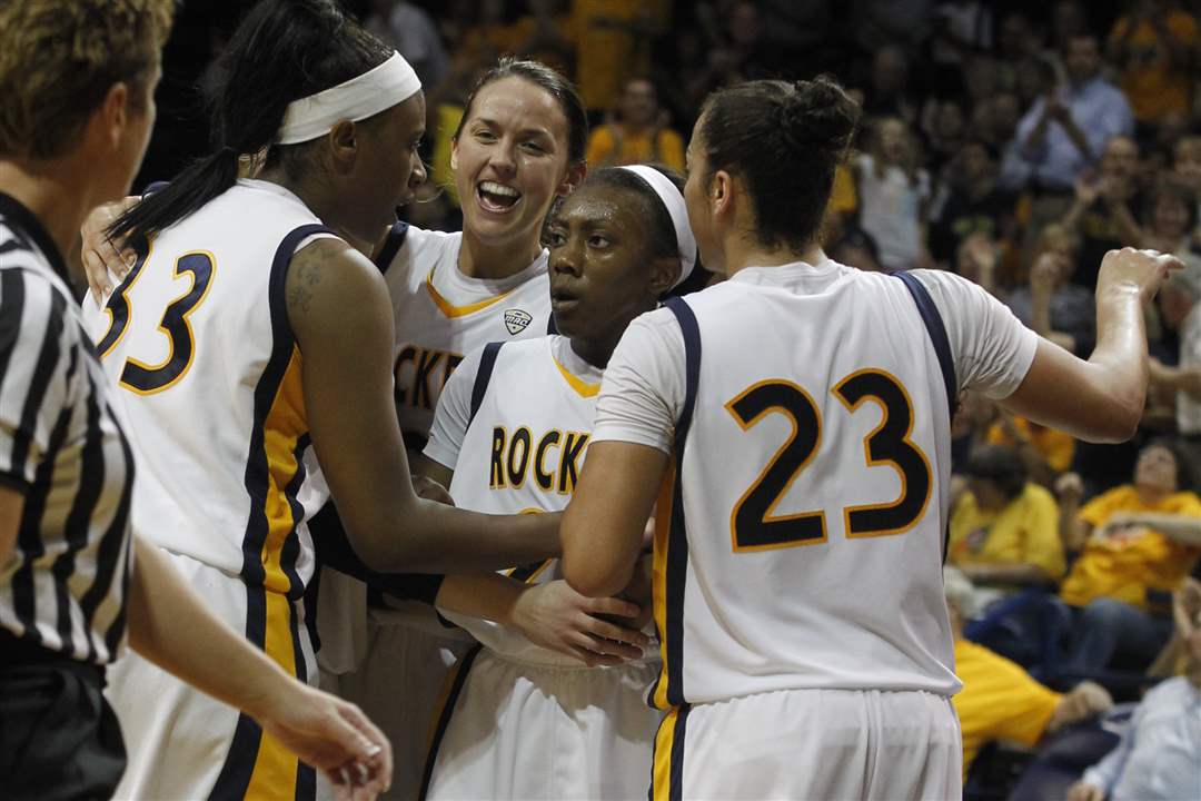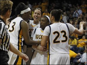 From left: UT's Lecretia Smith, Taylor Carver and Mariah Carson and head coach Tricia Cullop celebrate a play.