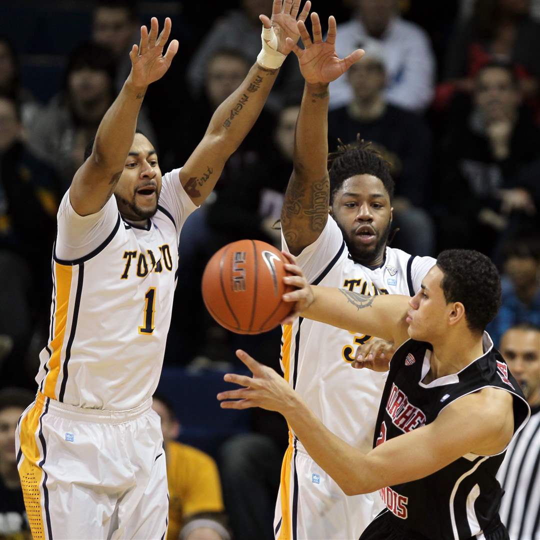University of Toledo guard Dominique Buckley (1) defends against Northern Illinois forward Abdel Nader (23).