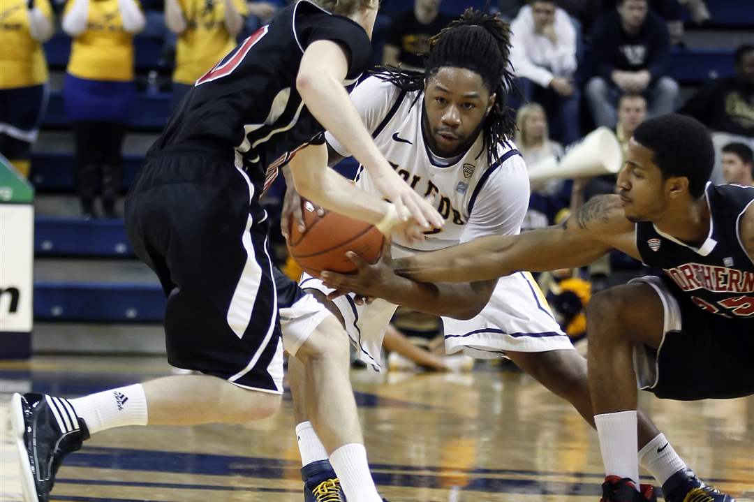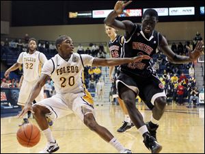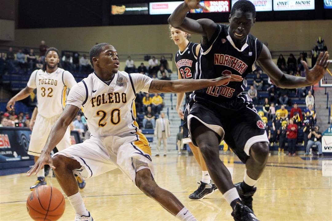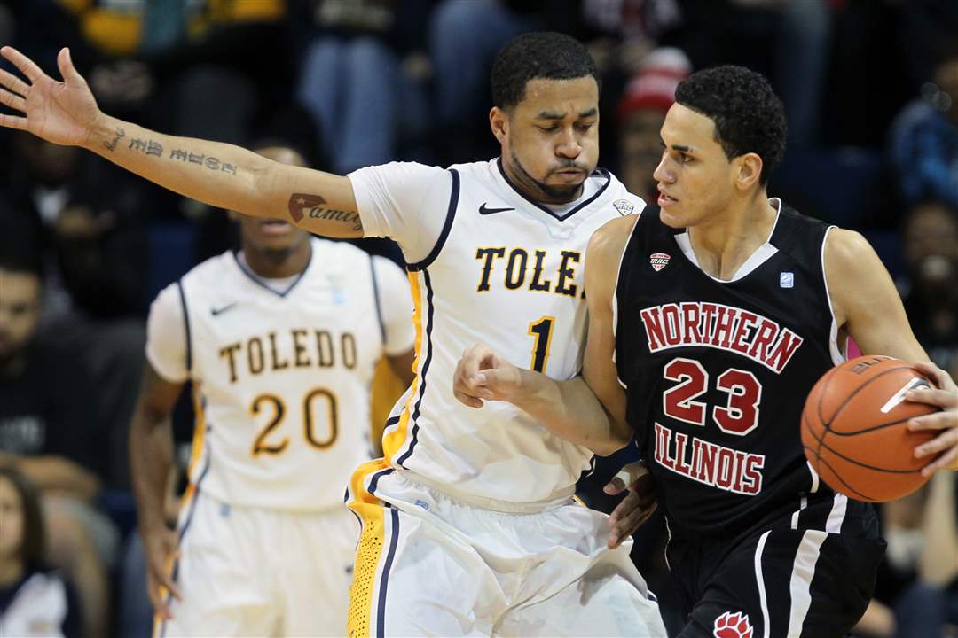 University of Toledo guard Curtis Dennis (33) drives past Northern Illinois guard Antone Christian (3).