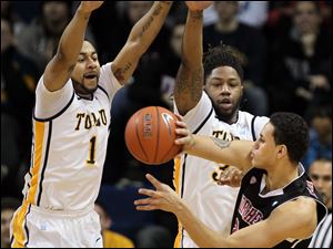 University of Toledo guard Curtis Dennis (33) goes to the net against Northern Illinois guard Tony Nixon (25).