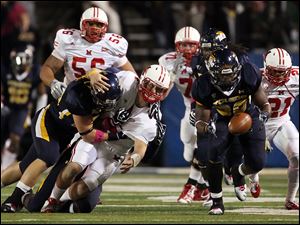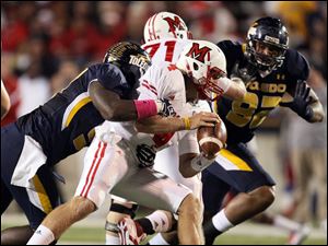 University of Toledo defensive end Ben Pike (30) forces Miami quarterback Zac Dysert (4) to fumble during the second quarter.