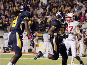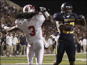 University of Toledo running back Morgan Williams (23) scores a touchdown against Miami's Dayonne Nunley (3).
