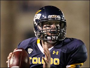 Toledo quarterback Terrance Owens (2) dives backwards for extra yardage against Miami safety Anthony Kokal (18) Saturday.