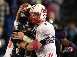 Miami quarterback Zac Dysert (4) is sacked by University of Toledo defensive end Malcolm Riley (97) during the first quarter.