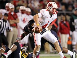 University of Toledo receiver Eric Page (12) reaches for extra yardage against Miami's Dayonne Nunley (3) during the first quarter.