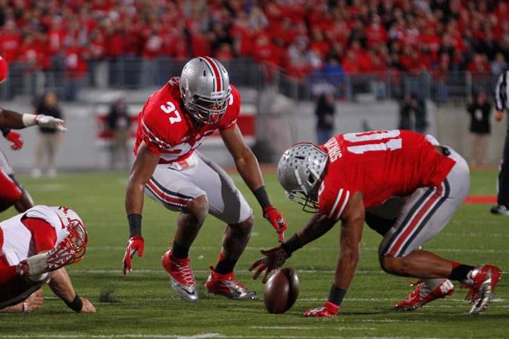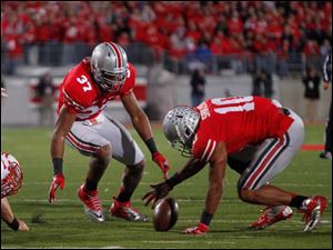 Ohio State defender Ryan Shazier (10) chases Nebraska QB Taylor Martinez's fumble during the second quarter.
