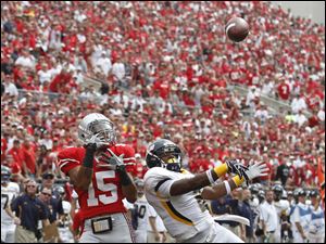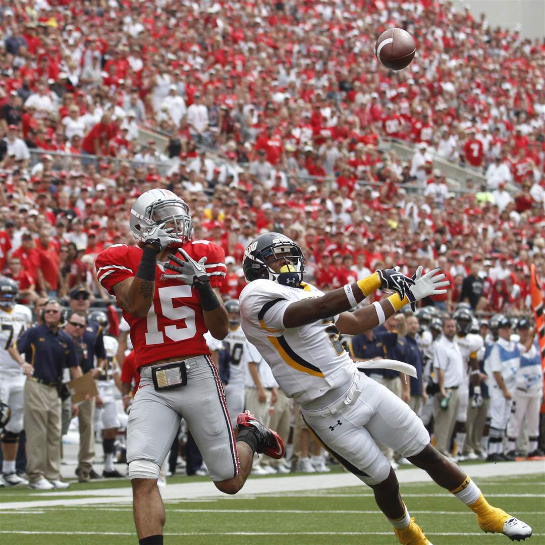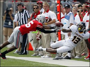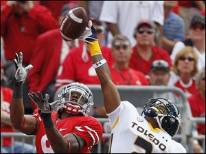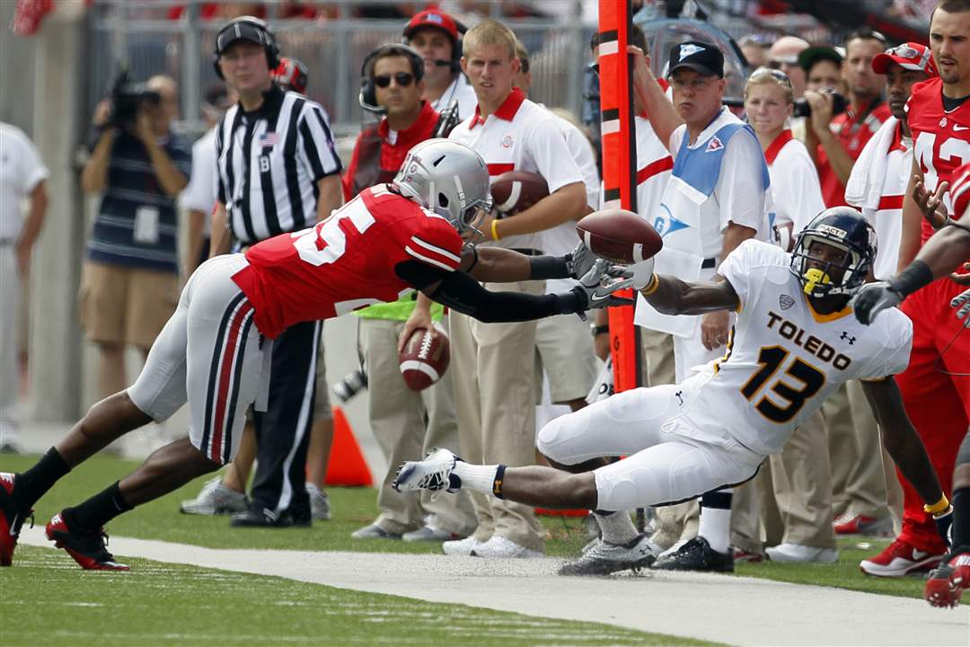 Toledo receiver Cordale Scott (13) tries to make a catch as Ohio State cornerback Bradley Roby (25) defends.