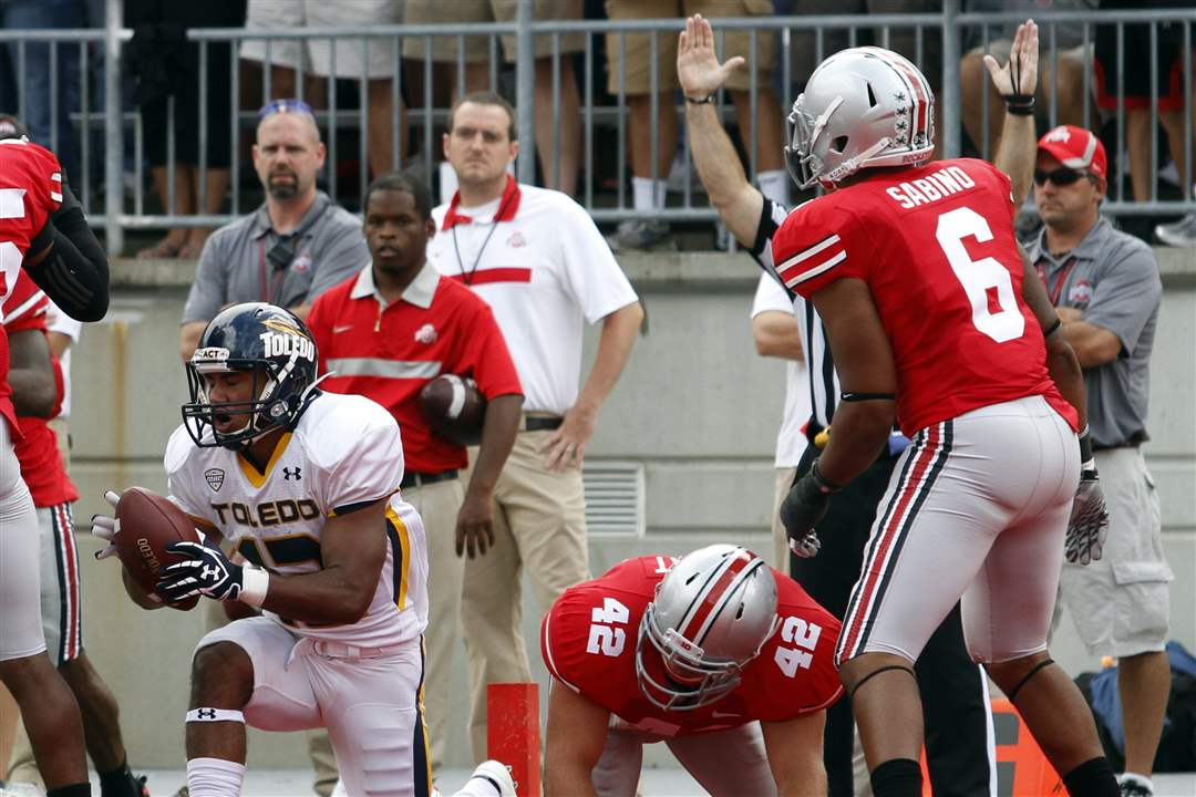 Toledo wide receiver Eric Page (12) scores his second touchdown of the first half against Ohio State free safety C.J. Barnett (4) during the first quarter.