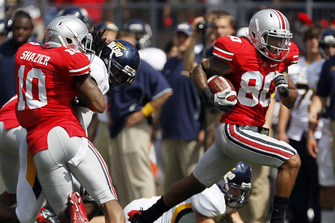 Ohio State's Chris Fields (80) returns a punt for a touchdown against Toledo during the second quarter.