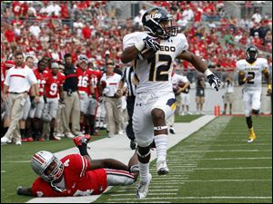 Toledo wide receiver Eric Page (12) scores his first touchdown of the first half against Ohio State defenders Andrew Sweat (42) and Etienne Sabino (6).