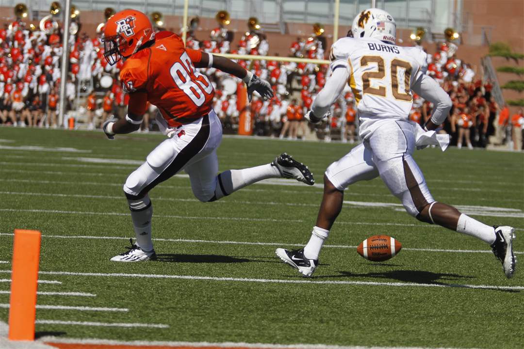 BGSU's Kamar Jorden reaches for an overthrown pass against Wyoming.